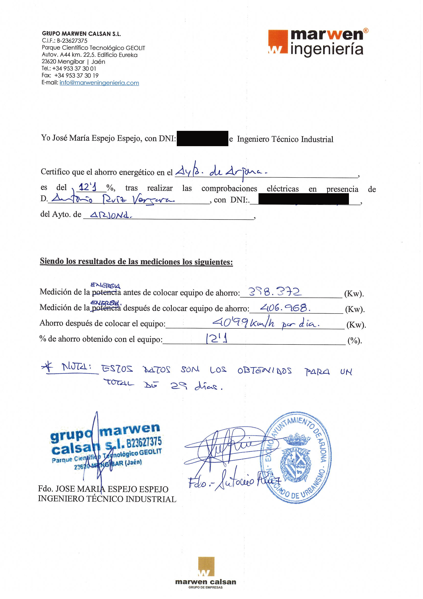 Dicho estudio reflejará el porcentaje de ahorro en energía activa garantizado y estimado. El porcentaje de ahorro por sustitución de luminarias y controles de presencia, sistemas de filtro de armónicos y corrección del factor de potencia, si fuera necesario.